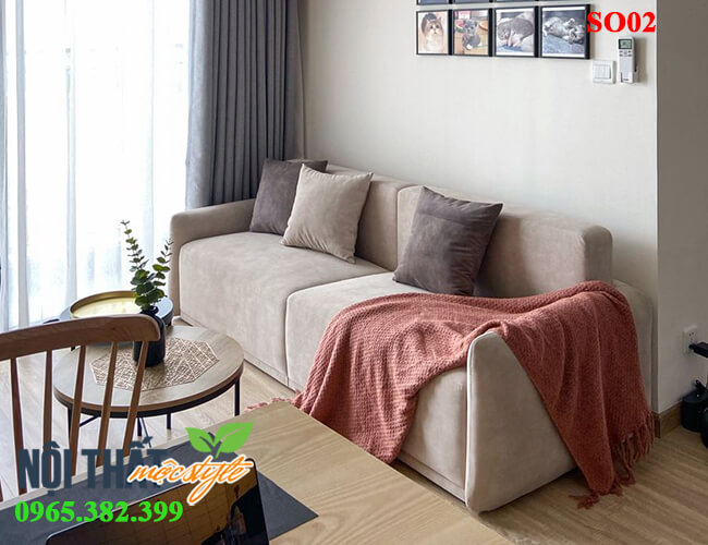 - Sofa phòng khách SO02, kiểu dáng trẻ trung, chân bọc nỉ dày, to, vô cùng êm. Lưng tựa thấp, tạo cảm giác trẻ trung, năng động, phù hợp với nhiều cách bài trì, sắp xếp, bày trì trong căn phòng.